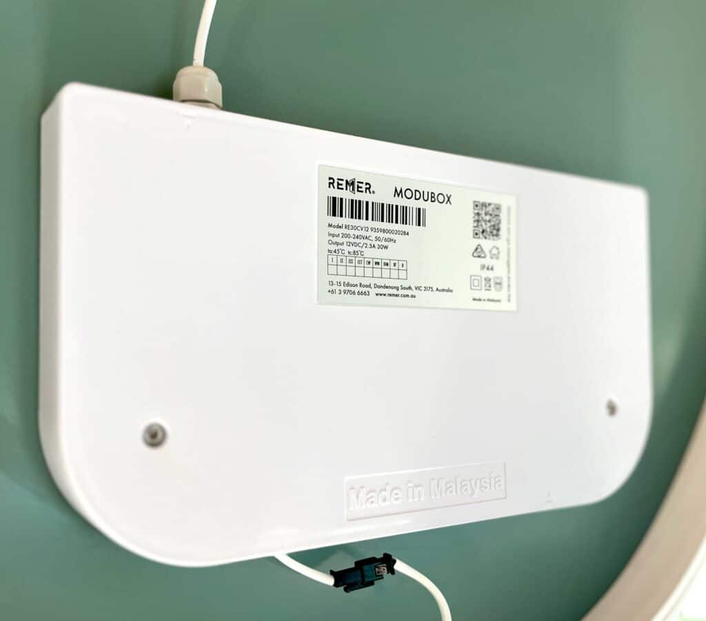 The Modubox™ is Remer’s intelligently engineered modular power unit, designed to house all mirror electronics — including LED drivers, demister controls, Bluetooth components (where applicable), and touch-sensor interfaces — within one accessible, replaceable enclosure. Built to meet stringent Australian IP rating standards, the Modubox™ allows technicians to service or replace individual components without removing or disposing of the entire mirror. The result is faster, hassle-free maintenance, reduced environmental impact, and long-term reliability across all next-generation Remer mirrors.